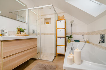 V horním patře se pak nacházejí tři ložnice a super-praktická samostatná šatna. Kromě komfortní koupelny se sprchovým koutem i vanou se zde nachází i druhá samostatná toaleta.
