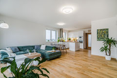 Spodnímu patru dominuje velký obývací pokoj s přilehlým moderním kuchyňským koutem ve světlých barvách. Díky krajnímu umístění domu je celý prostor krásně prosvětlený.